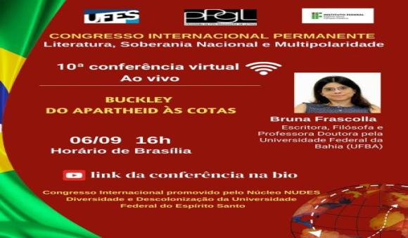 2. Em 06 de setembro de 2025, às 16h: Conferência da Filósofa, Escritora e Profª. Drª. Bruna Frascolla (UFBA): "Buckley: Do apartheid às cotas".